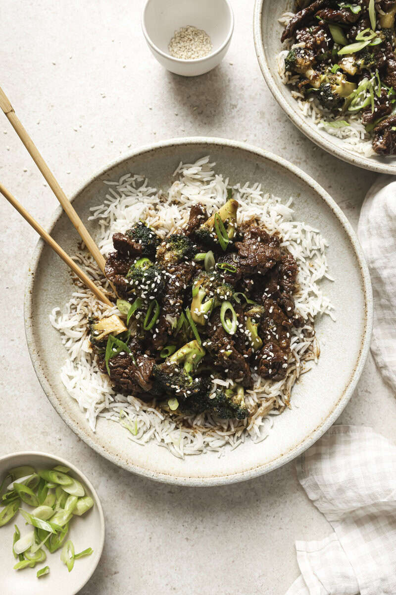 - Step 5: Return the beef to the pan, pour in the sauce, and simmer for 1 to 3 minutes until thickened. Serve topped with spring onions, sesame seeds and optional rice.
