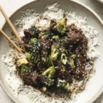 Tender strips of flank or sirloin steak are seared in light olive oil until beautifully browned, then tossed in a glossy sauce made with gluten free tamari, brown sugar, fresh garlic and zingy ginger.