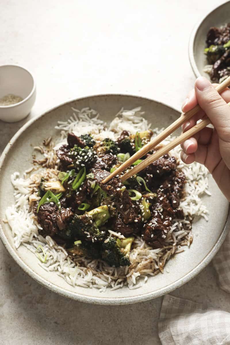 - Step 5: Return the beef to the pan, pour in the sauce, and simmer for 1 to 3 minutes until thickened. Serve topped with spring onions, sesame seeds and optional rice.