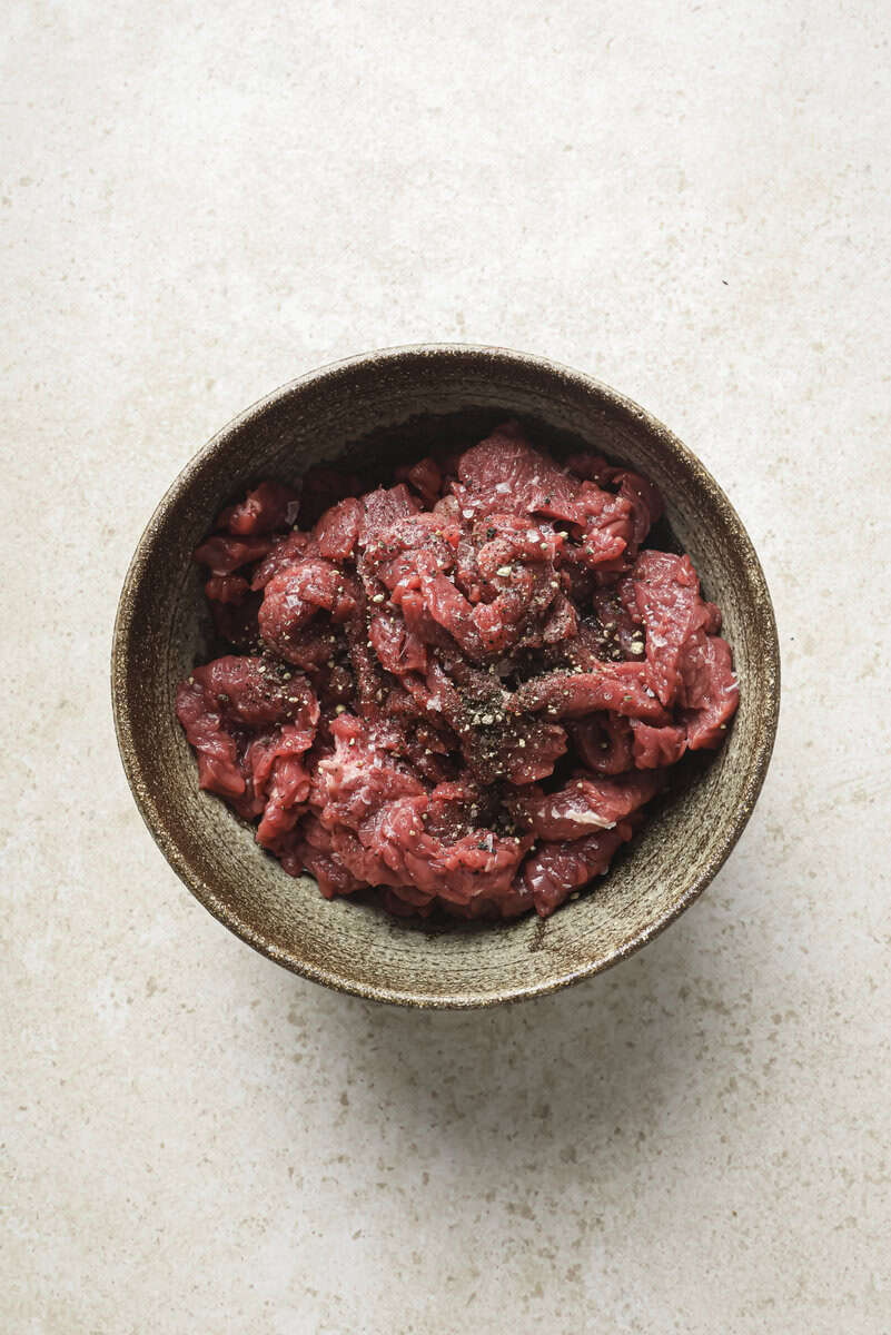 - Season the beef with ¼ teaspoon flakey sea salt and pepper.