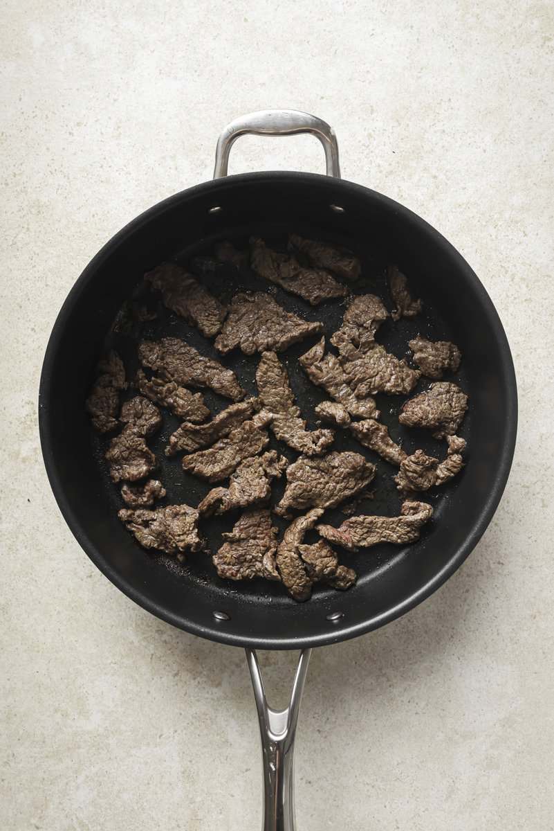 - Heat 1tbsp olive oil in a large non-stick frying pan over a medium heat. Add the beef and let it cook undisturbed for about 4 minutes (not stirring is what will give it a good sear.) Flip the beef sliced and then cook for 1 - 2 minutes more on the other side until cooked though. Set aside.