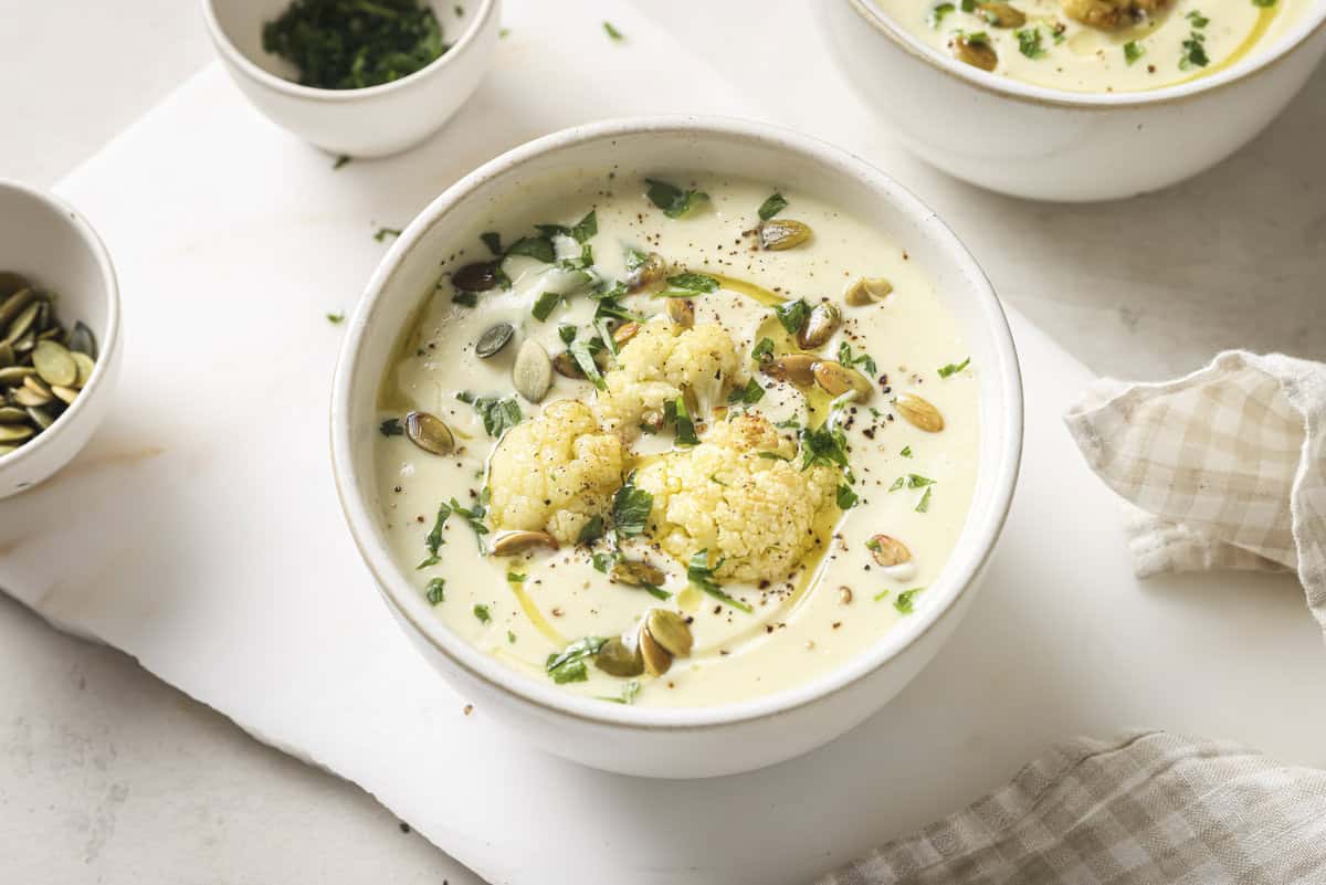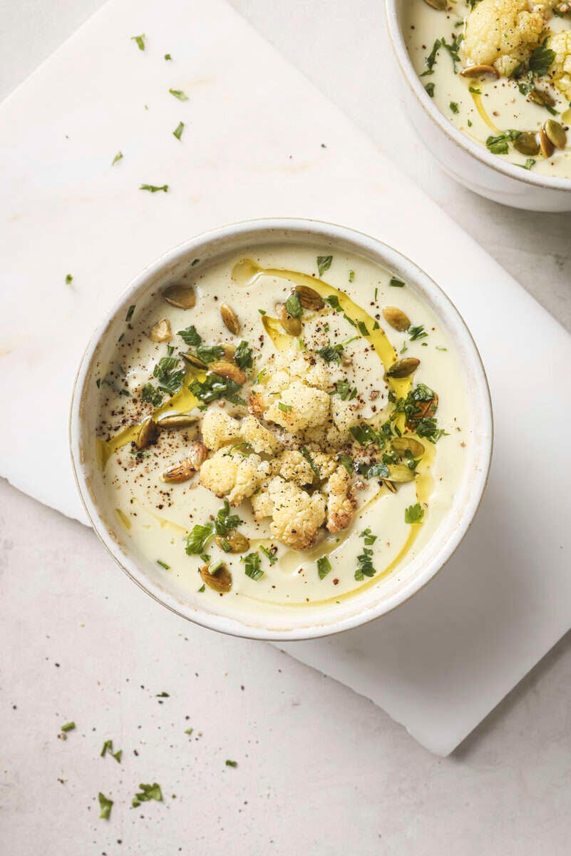 - Pour into bowls and top with set aside cauliflower florets, chopped herbs, toasted pumpkin seeds, black pepper and a good drizzle of olive oil.