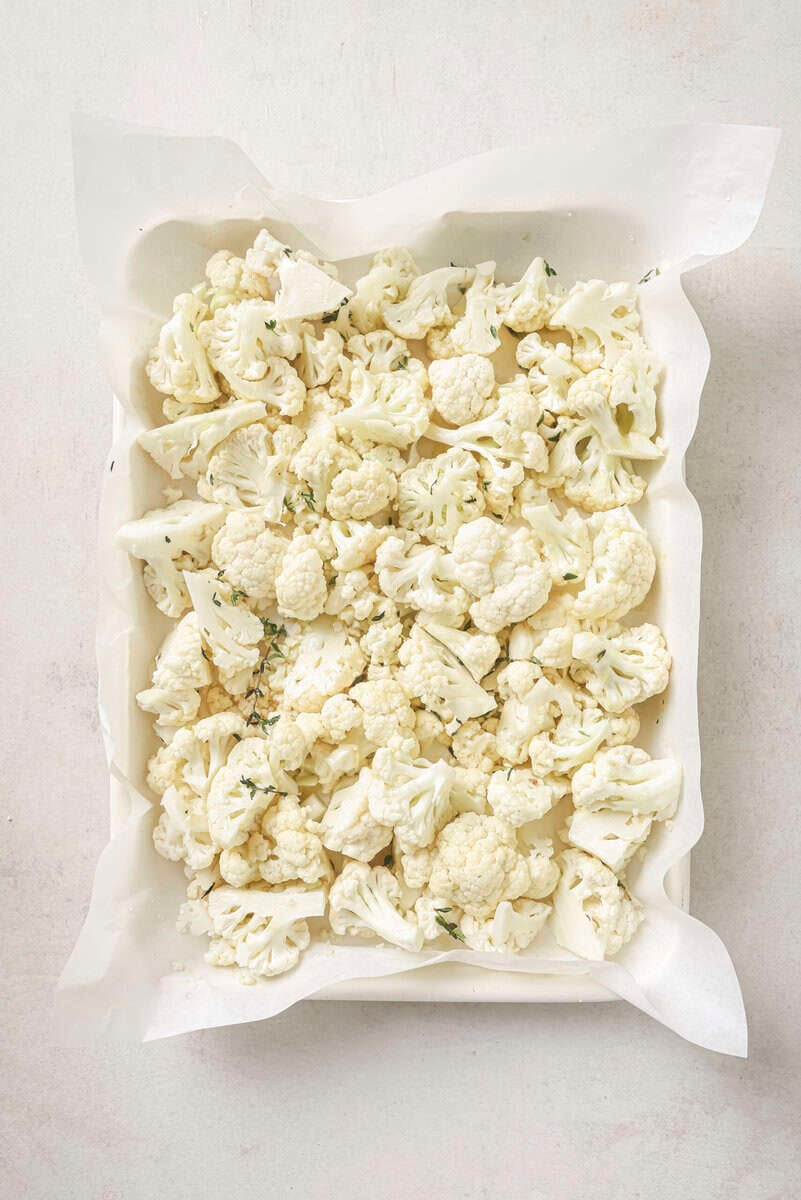 - Step 1: Preheat the oven to 400°F and line a baking tray with parchment paper. Toss the cauliflower florets with olive oil, thyme, and salt, then roast for 25-35 minutes, tossing halfway, until tender and golden.