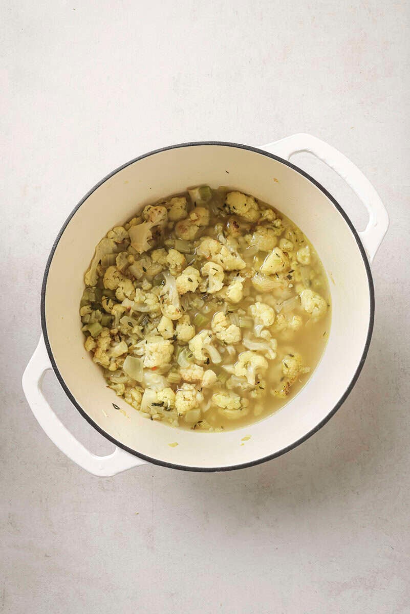 - Step 3: Set aside a few roasted cauliflower florets for garnish, then add the rest to the pot with the broth and a pinch of salt. Bring to a boil, reduce to a simmer, and cook for 20 minutes.